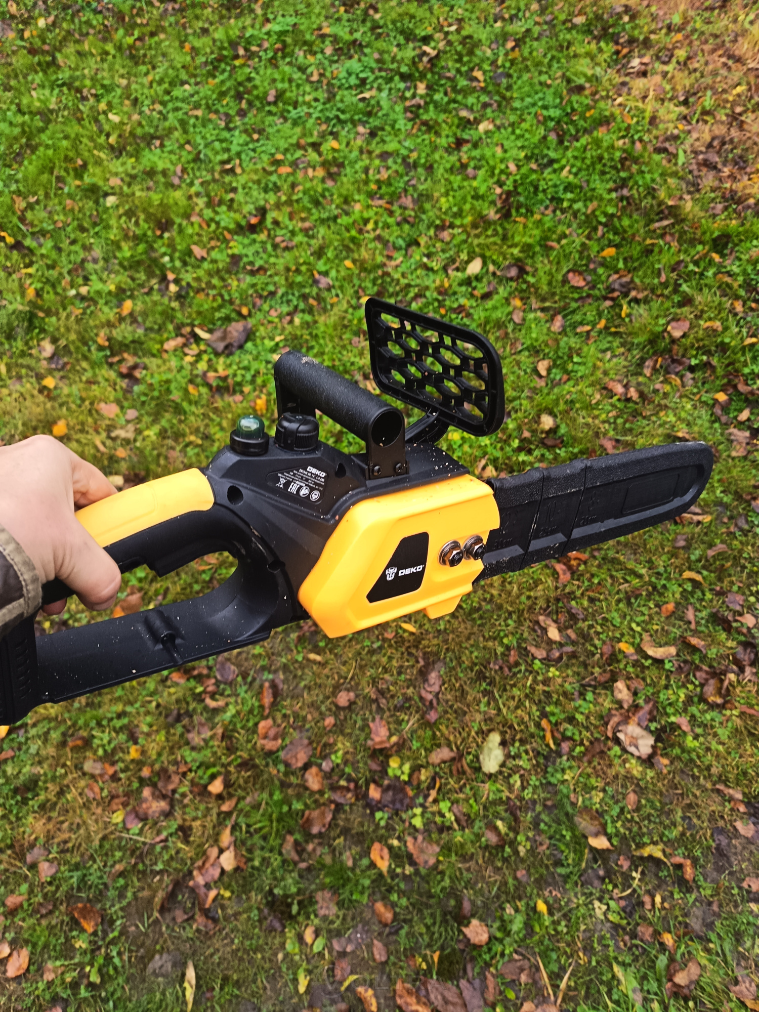 А сейчас, самый честный отзыв на бюджетную пилу!!! Начнём с упаковки: пришло всё, комплект полный, инструкция на русском языке, батарея заряжена полностью, хотя с момента выпуска прошло 9 месяцев, зарядное заряжает примерно 1,5 часа при неполном разряде на 1 делении. Цепь острая, шина тяжёлая, кожух на шину с цепью с первого раза не удалось надеть, пришлось край кожуха приплюснуть. Пила лёгкая, рукоятка удобная, можно пилить одной рукой небольшие сучки, распиливает 20 см в диаметре без усилия, а вот заряда аккумулятора хватит на продолжительное время, если это сучки, а если это стволы деревьев то разряжается быстро, в зависимости от плотности древесины. Оборотов достаточно, пилит равномерно. Щиток у пилы очень ранимый, пришлось укрепить металлическим уголком, но это не критично. При работе с пилой, было замечено, что масло не поступало с отверстия подачи на цепь, отдельное спасибо службе поддержки, проблему устранили, произошла завоздушка. Пока, сложно сказать, как долго прослужит, но на данный момент очень довольна, не нужно использовать тяжёлую бензопилу для кратковременных работ на участке.