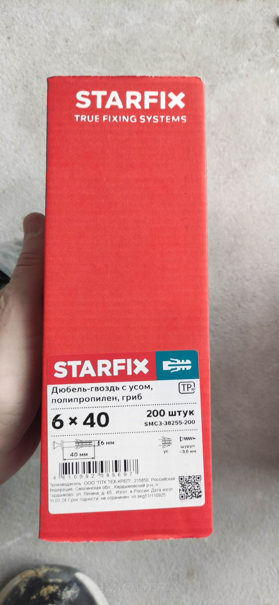 Достоинства: Хорошего качества дюбель-гвоздь с грибком у основания. Предназначен для отверстий 6 миллиметров и длиной от 40 миллиметров. Дюбеля хорошие , выполнены из пластика средней жёсткости. Гвозди нарезаны хорошо под крестовую отвертку. Поставляется в индивидуальной упаковке по 200 штук. Фирма производитель STARFIX