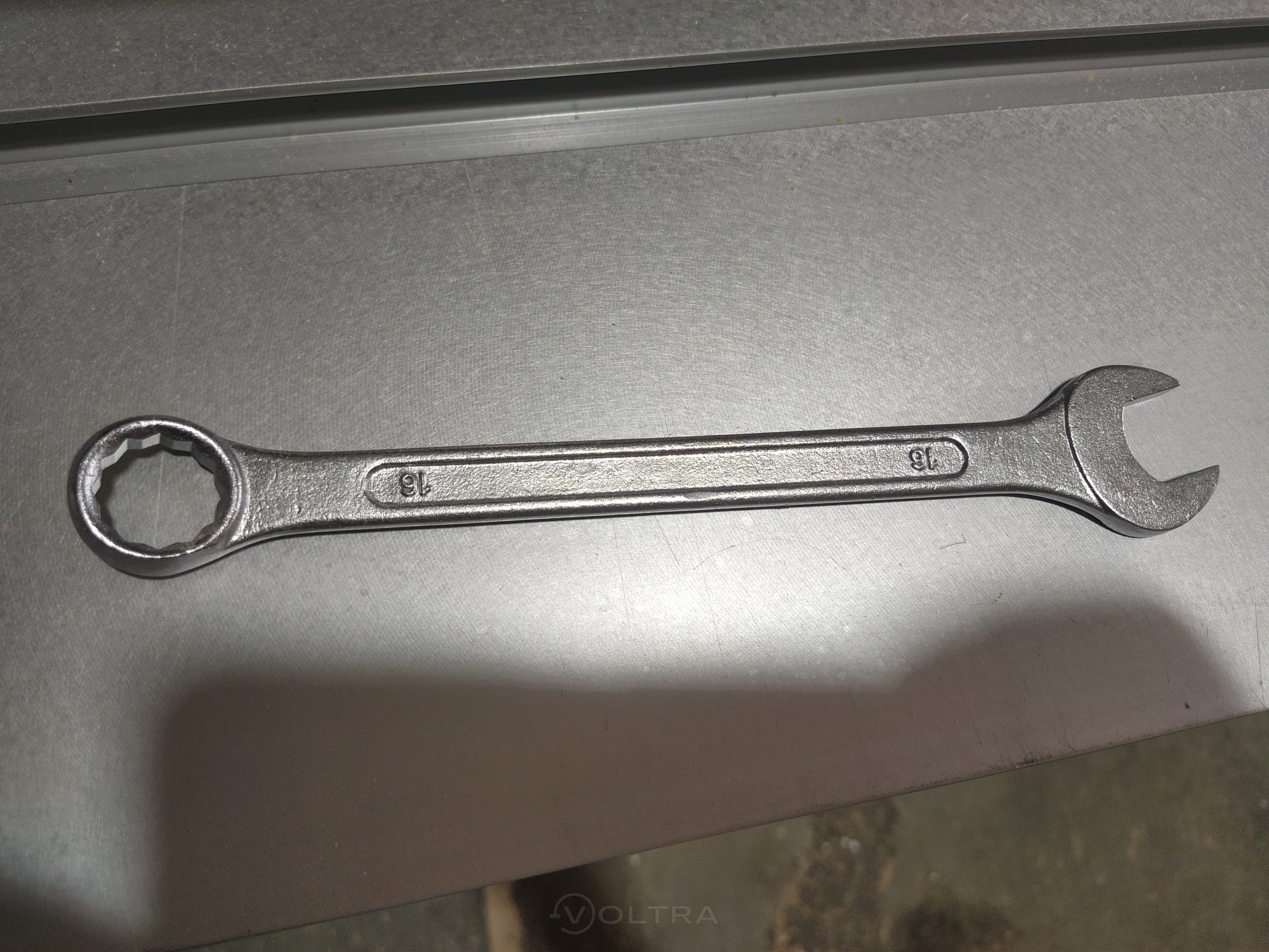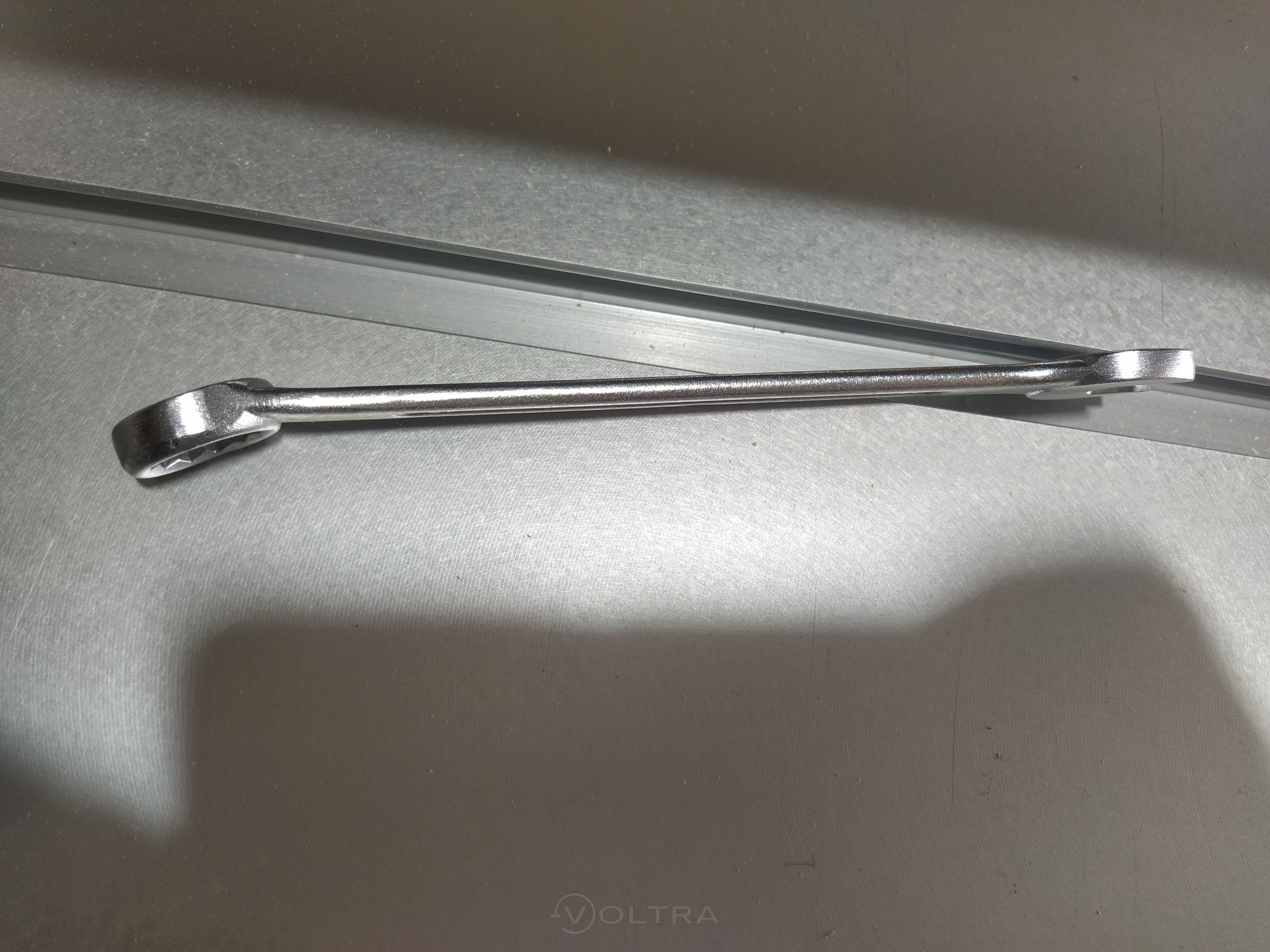 Комбинированный ключ имеет с одной стороны рожковую форму, с другой стороны кольцо с 12-ю гранями. Ручка со стороны кольца немного изогнута, что позволит использовать ключ в ограниченном пространстве. Ключ хорошо обработан, нет заусенцев и острых кромок. Покрытие со всех сторон выглядит равномерным, маркировка размера хорошо читается.