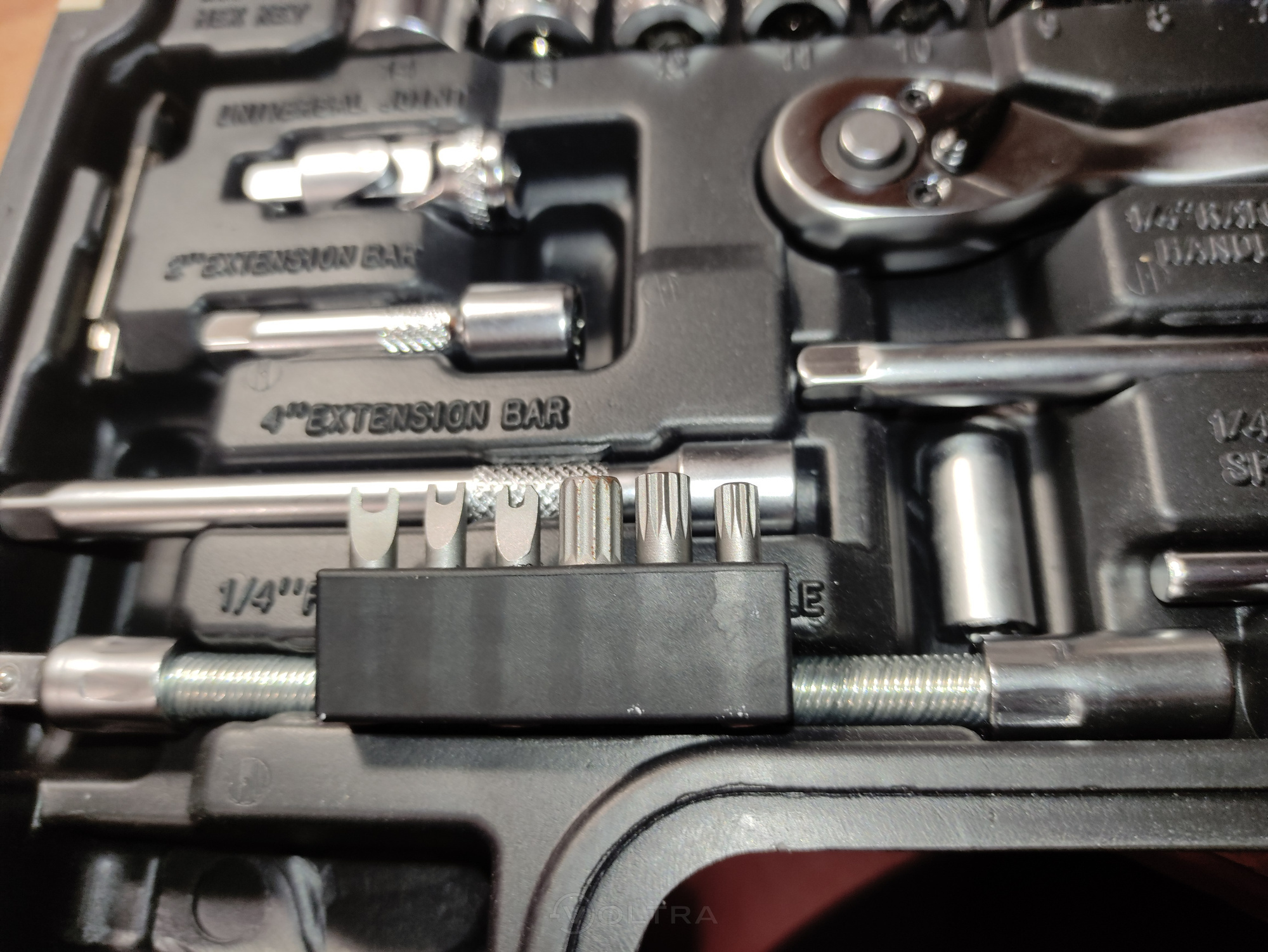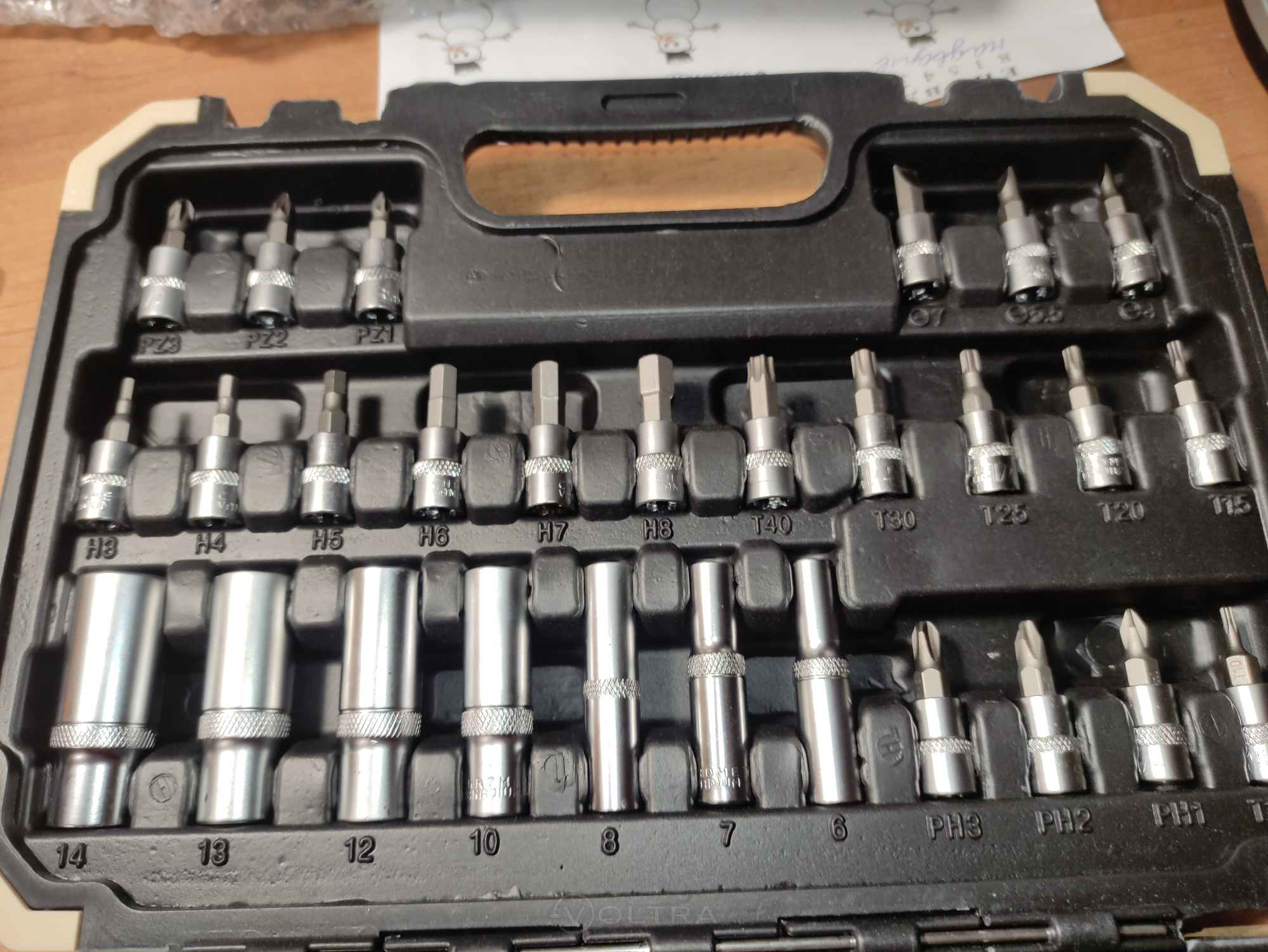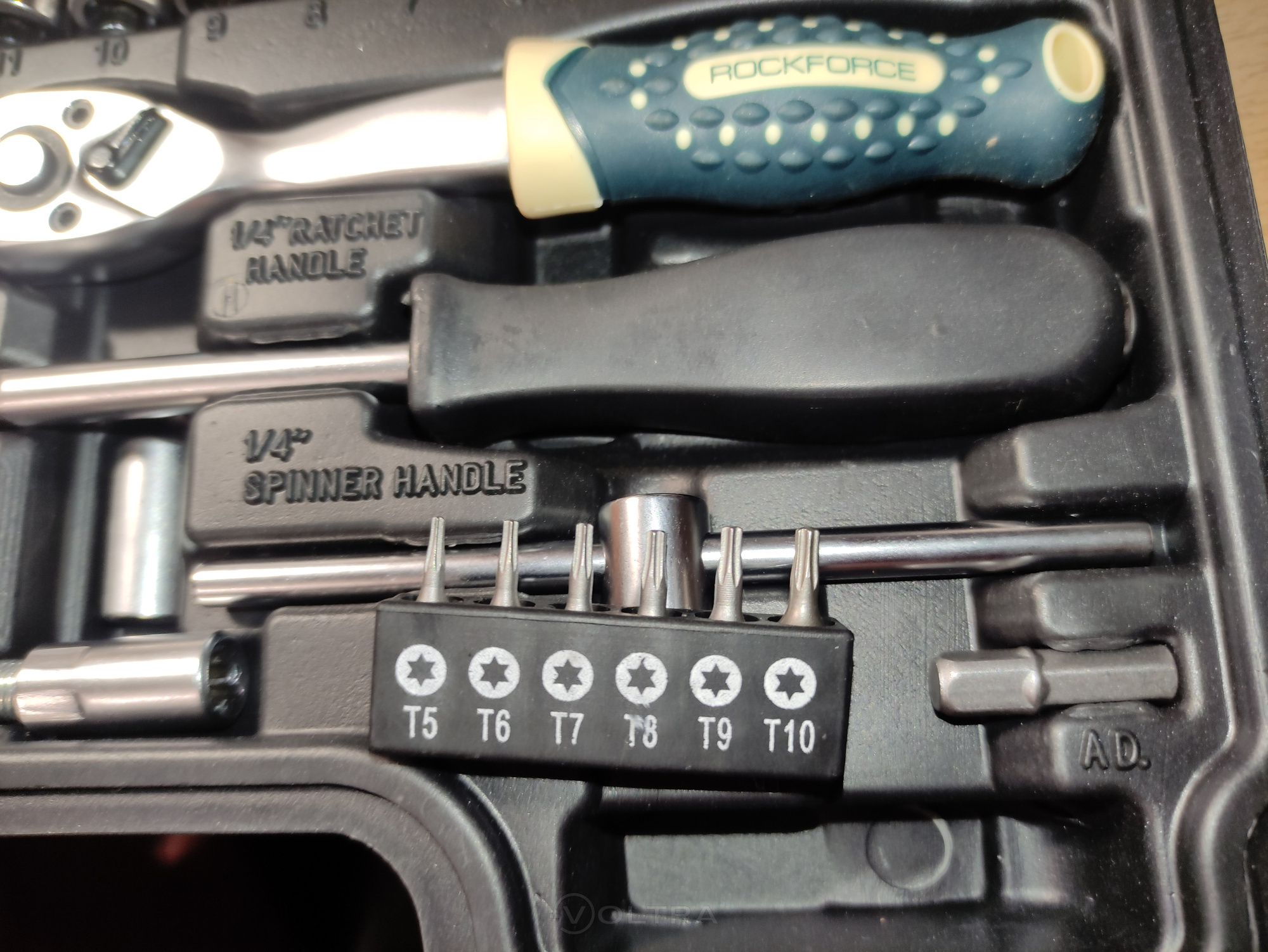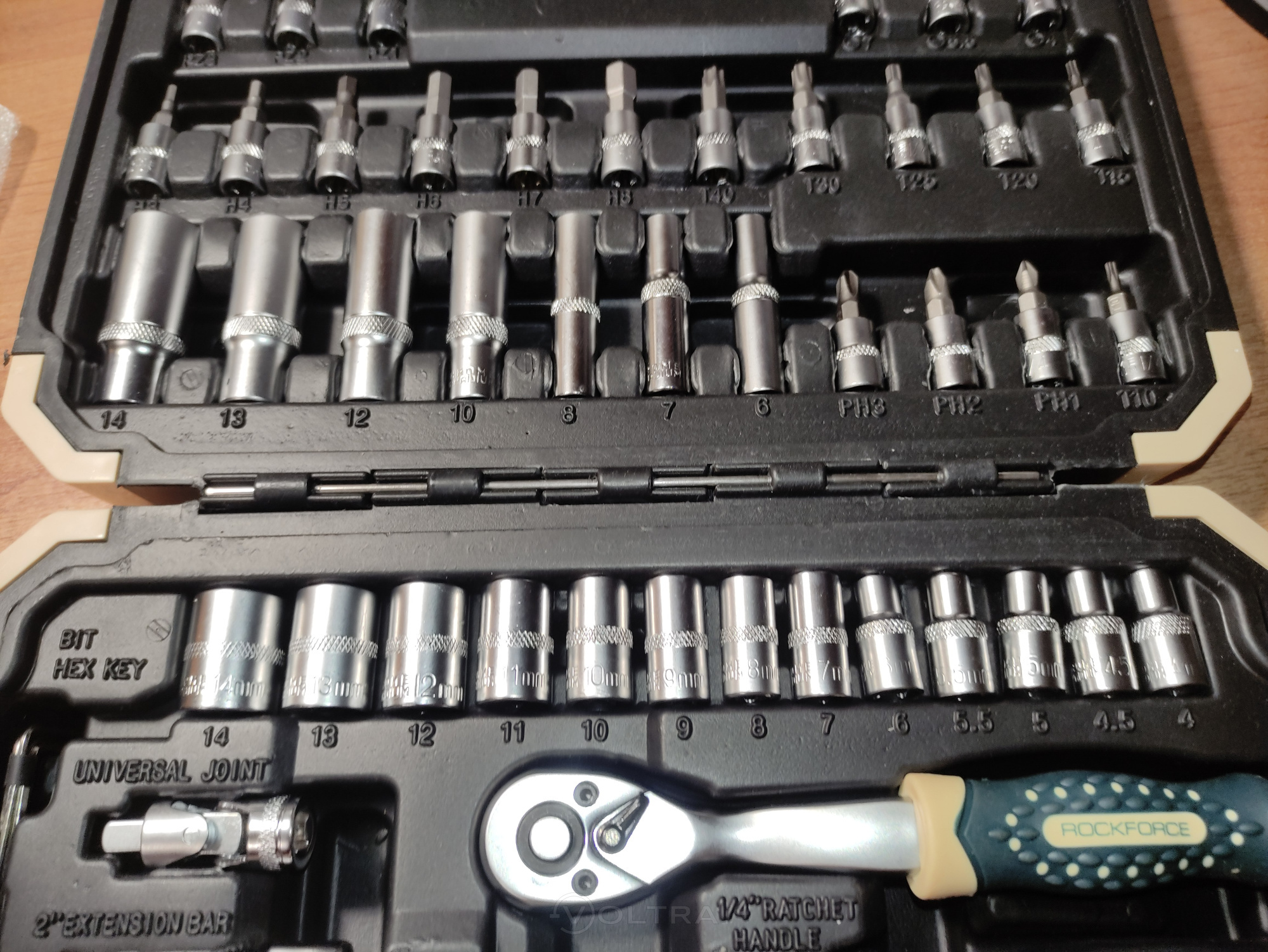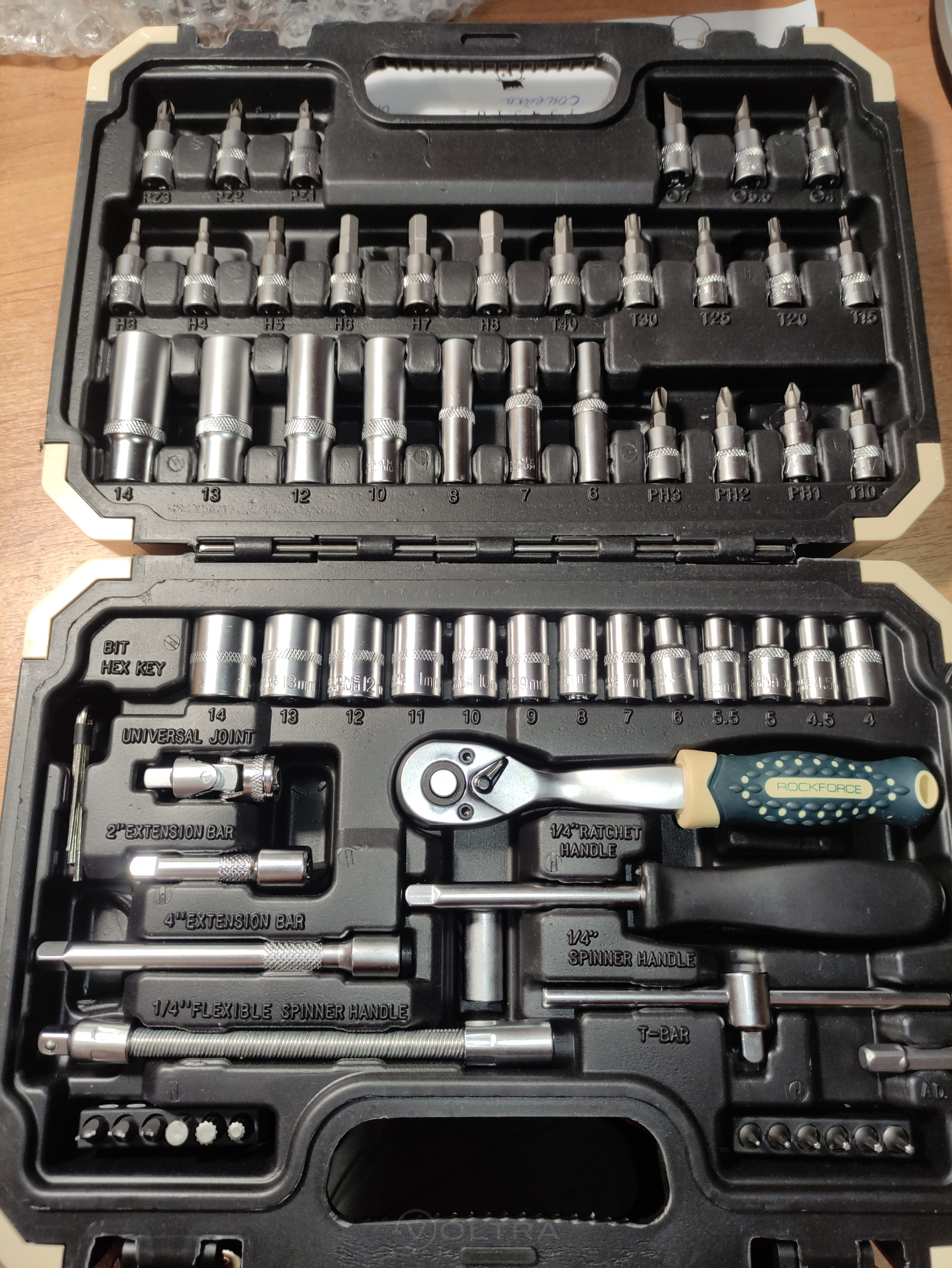 Достоинство данного набора цена. По качеству изготовления набор изготовлен хорошо, пластиковый чемодан не хлипкий. В наборе от обренда RockForce похоже только трещетка и рукоятка, так как ни на одном предмете нет гравировки с названием бренда RockForce, только надпись на рукоятки трещотки и отвёртки. Защитное покрытие металлических предметов отличное. На головках-битах отсутствуе гравировка с номером размера головки-биты, номер есть только на самой бите, который чуть виден из под головки. Сами биты на вид изготовлены хорошо, но разные по дизайну. Для дома самое то, для гаража,ремонта автомобиля наверное долго не выдержит.