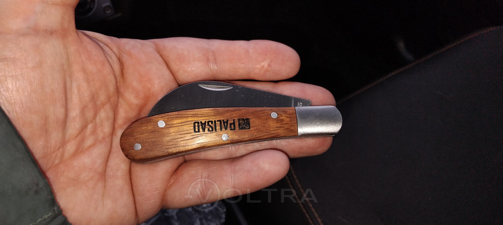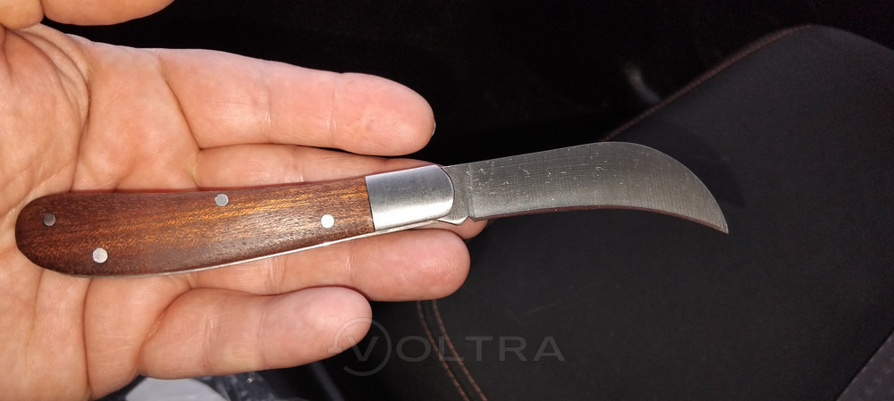 Изогнутое лезвие легко справляется с обрезкой веток и прививкой. Ручка приятная из дерева. Держит заточку хорошо, складная конструкция открывается и закрывается легко .