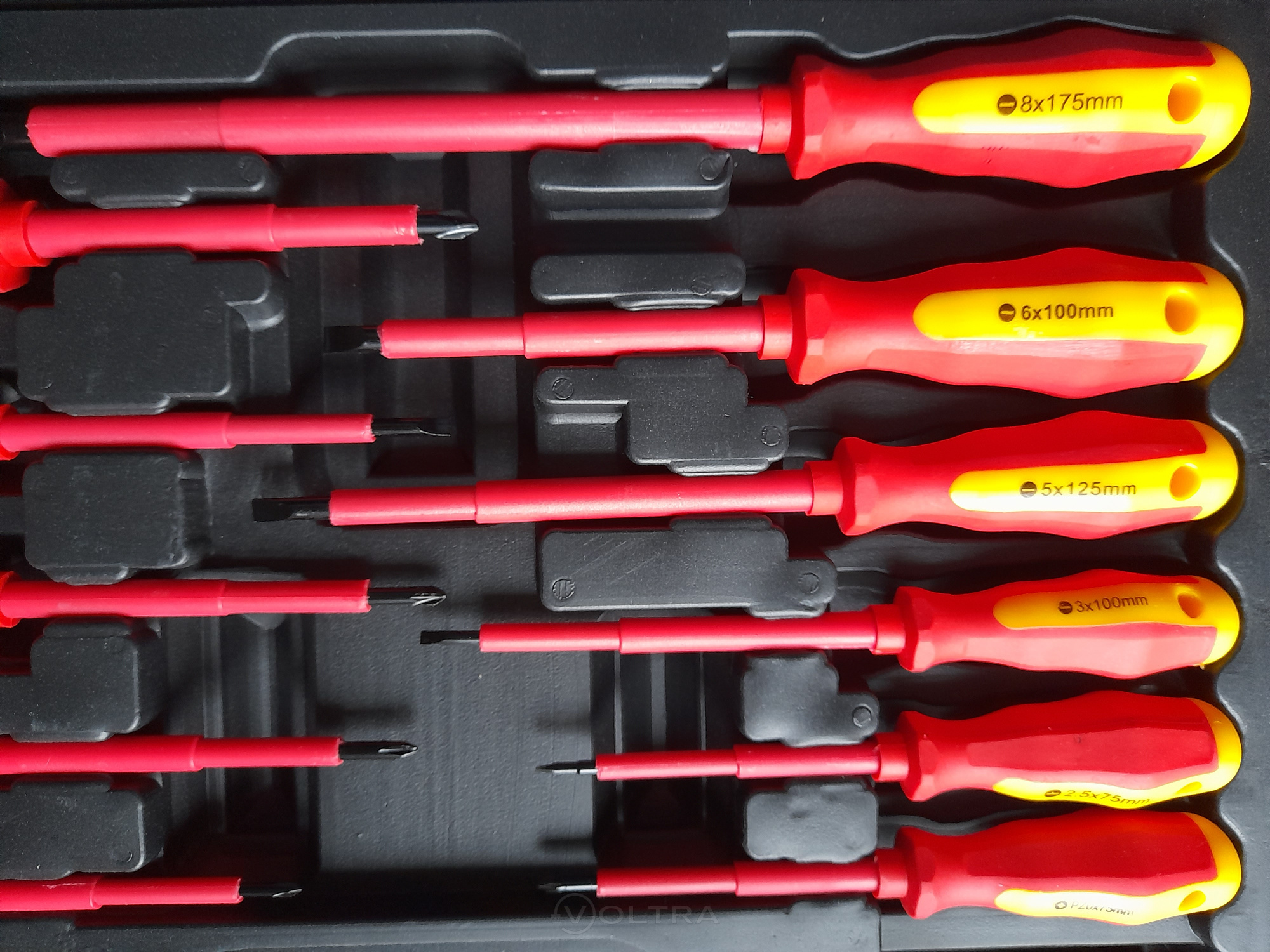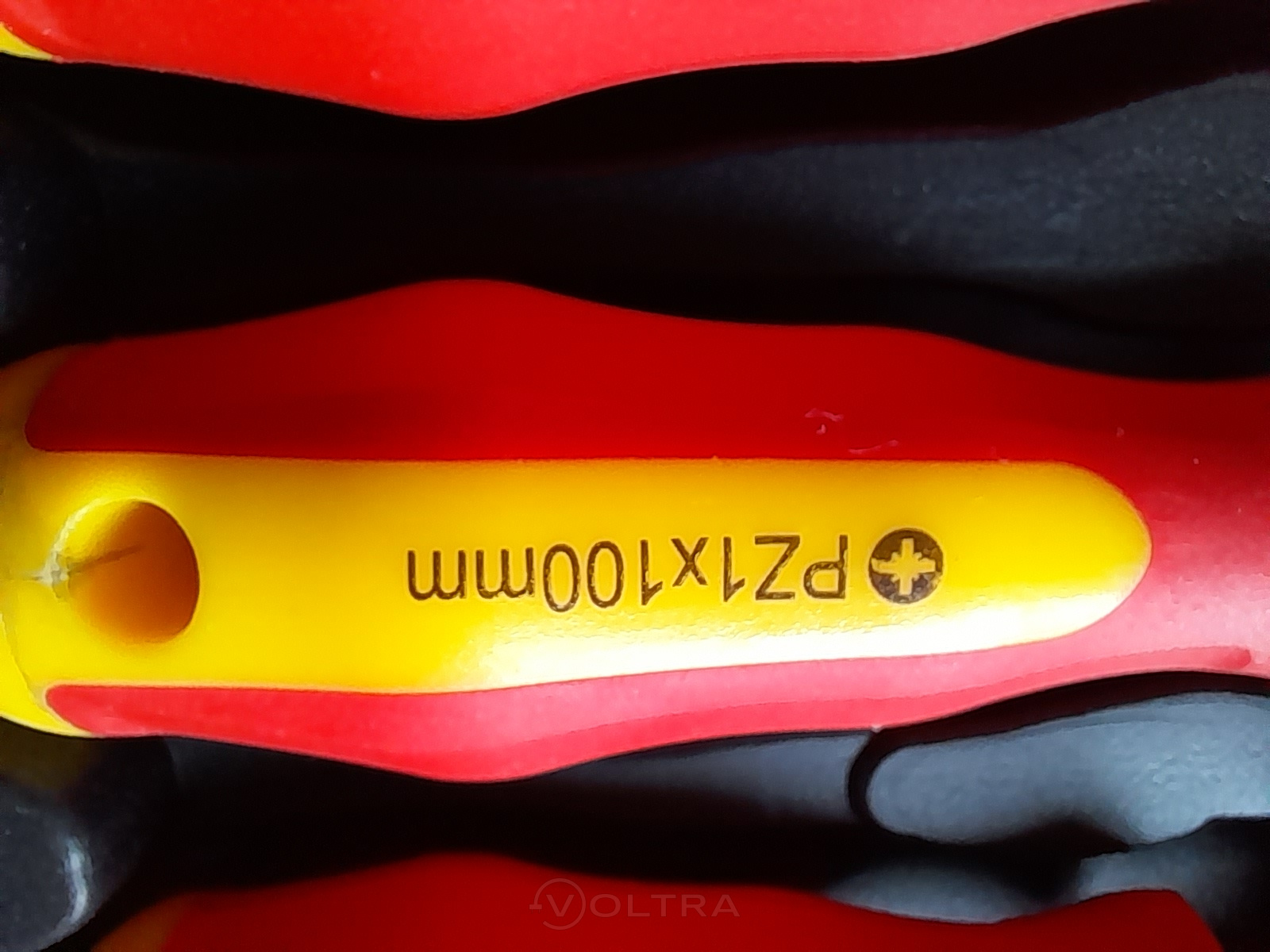 Отзыв начну с самого главного для такого типа инструмента, который предназначен для работы под напряжением. Производитель заявляет что это диэлектрические отвёртки. Но на них отсутствует маркировка соответствия стандарту ГОСТ IEC 60900-2019. Обычно указывают максимальное рабочее напряжение и символ два треугольника.Ни на одной из отвёрток такой маркировки вы не отыщите. Следовательно отвёртки не проходили испытания. Получается что это обычная отвёртка, например для слесарных работ, а не для работы под напряжением, и вы можете только на свой страх и риск использовать их. В наборе идёт 11 отвёрток, но почему-то производитель не комплектует набор 12 отвёрткой типа PZ2. Очень странно, ведь винты PZ2 тоже часто встречаются при монтаже. По внешнему виду качество отвёрток приемлемое. Жала отвёрток вплавлены в рукоятку ровно и соосно. Рукоятки по окружности имеют шестигранную форму, с фасками на гранях. В руке удобно держать и крутить винты. Набор поставляется в кейсе, который не маленького размера, где-то 40 на 25 см..Носить его с собой не удобно. Скорее всего отвёртки вы будете носить в сумке или другом кейсе совместно с другим инструментом. Но тут возникает другая проблема, найти необходимую отвёртку в куче других отвёрток и инструмента будет не легко. На рукоятке отвёртки есть обозначения размера шлица, но шрифт не жирный и не крупный. На некоторых рукоятках читается хорошо, На других еле видно, какой-то бледный, и при недостаточном освещении не читается. Не плохо было бы на торце рукоятке маркировать тип шлица, как это делают другие производители инструмента. Пока использовал в работе только три отвёртки. Жала отвёрток пока не сломались и не слизались, Но и больших нагрузок к ним не прикладывал.. Со временем настоящего использования станет ясно из какого металла они сделаны.