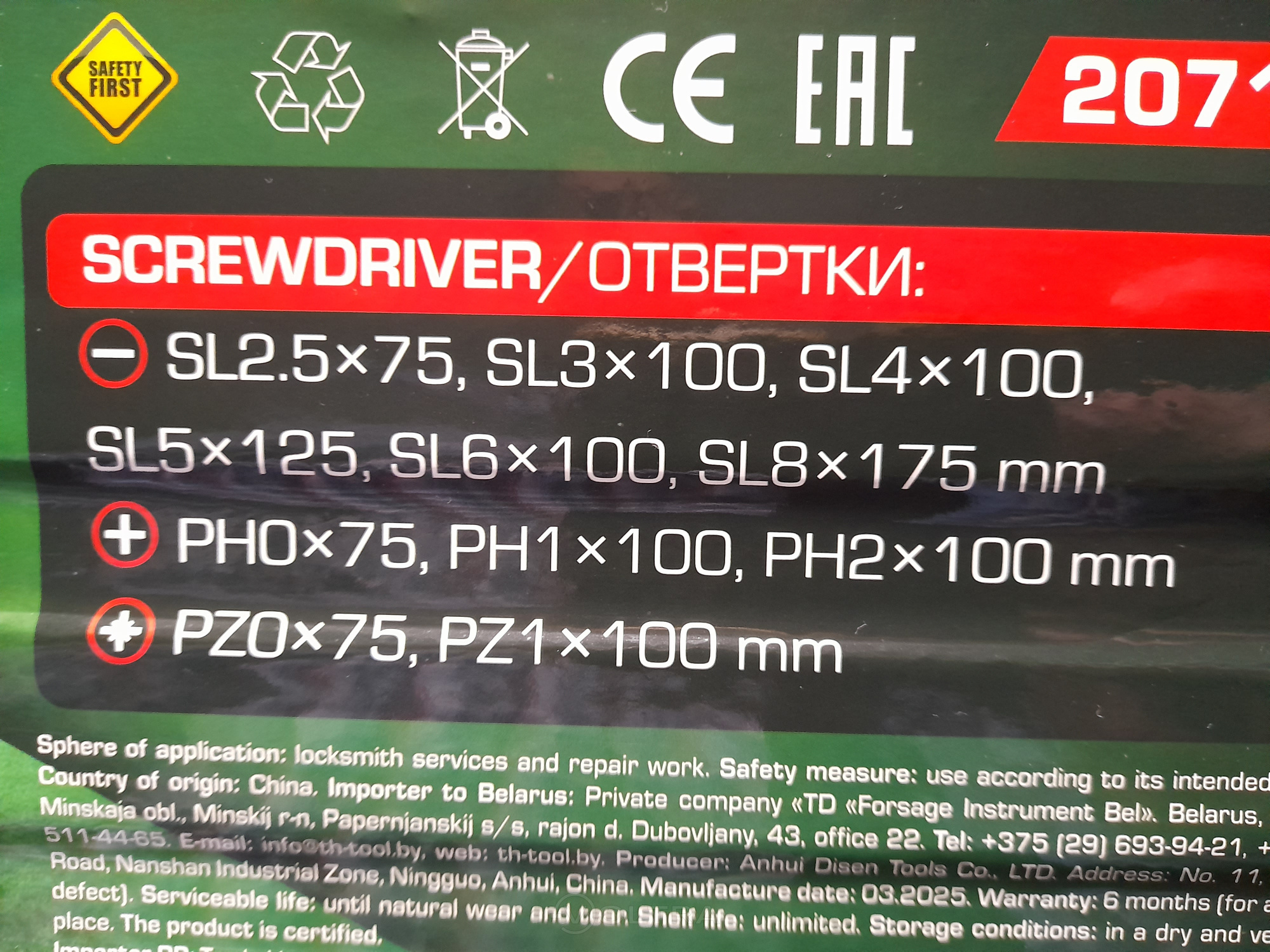 | Размер наконечника | PH0, PH1, PH2, PZ0, PZ1, SL2.5, SL3, SL4, SL5, SL6, SL8 |