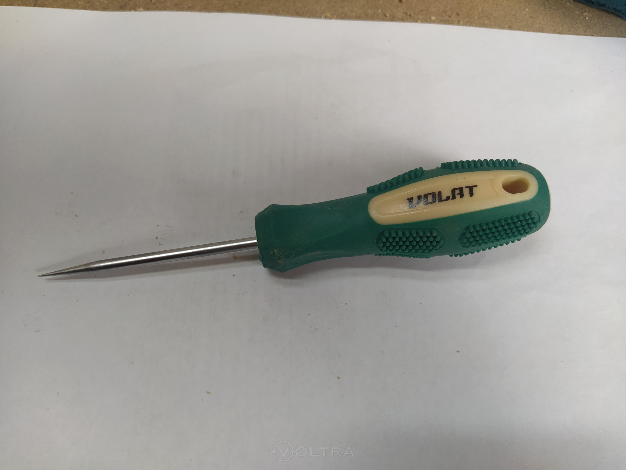 Удобная, эргономичная ручка с нескользящим покрытием. Отверстие в ручке для подвешивания на крючок или штырь. Наконечник достаточно твёрдый, хорошо подходит для накалывания меток для сверления отверстий и закручивания шурупов в дереве и ДСП. Надпись на ручке достаточно быстро стёрлась. Недостатком являются небольшие шипы на ручке, между ними забывается грязь, пачкаются руки.