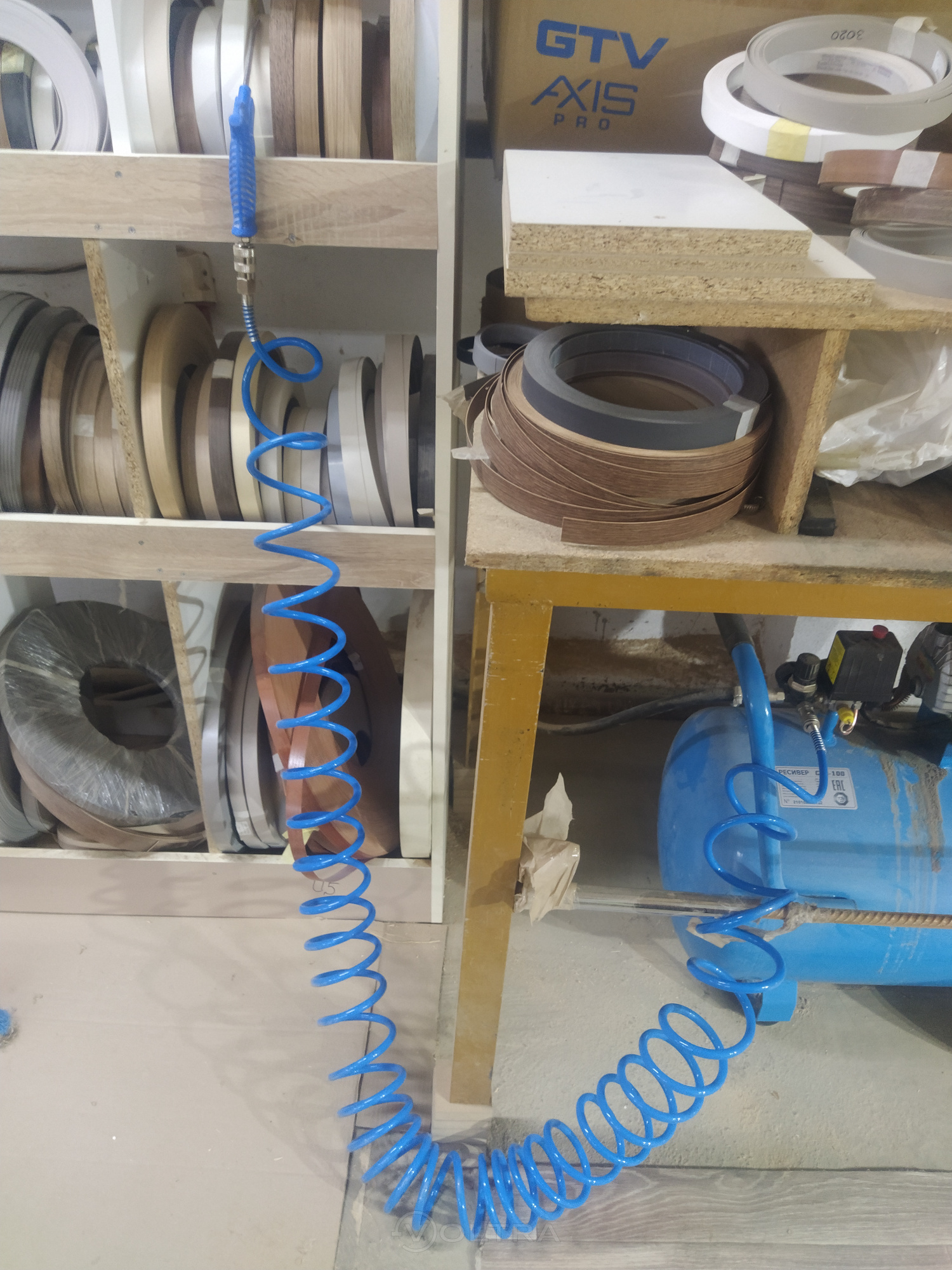 Отличный шланг! Мягкий, гибкий полиуретан, цвет в тон с компрессором. Хорошо растягивается. Отдельно хочу отметить наличие пружин около фитингов для предотвращения заломов шланга. Сами фитинги выполнены достаточно качественно, утечек воздуха нет. Общее впечатление положительное, рекомендую к покупке.