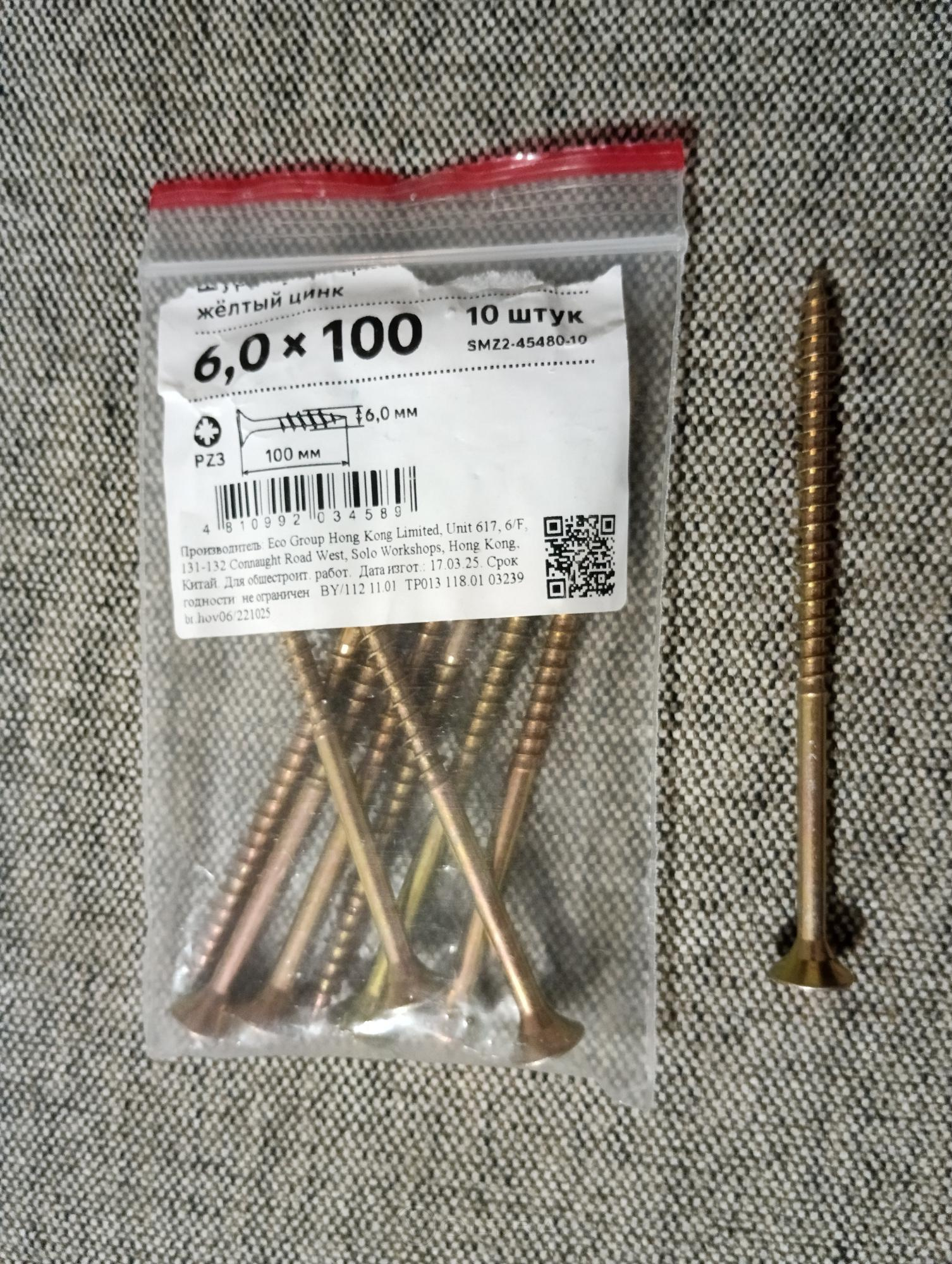 Пришли упакованными в полимерный зиплок пакет, упаковка плотная не порвалась. Сами саморезы ровные, размеры соответствуют указанным в описании. Выглядят крепкими, при закручивании не гнулись. Поверхность имеет какое-то золотистое покрытие, на упаковке написано жёлтый цинк.