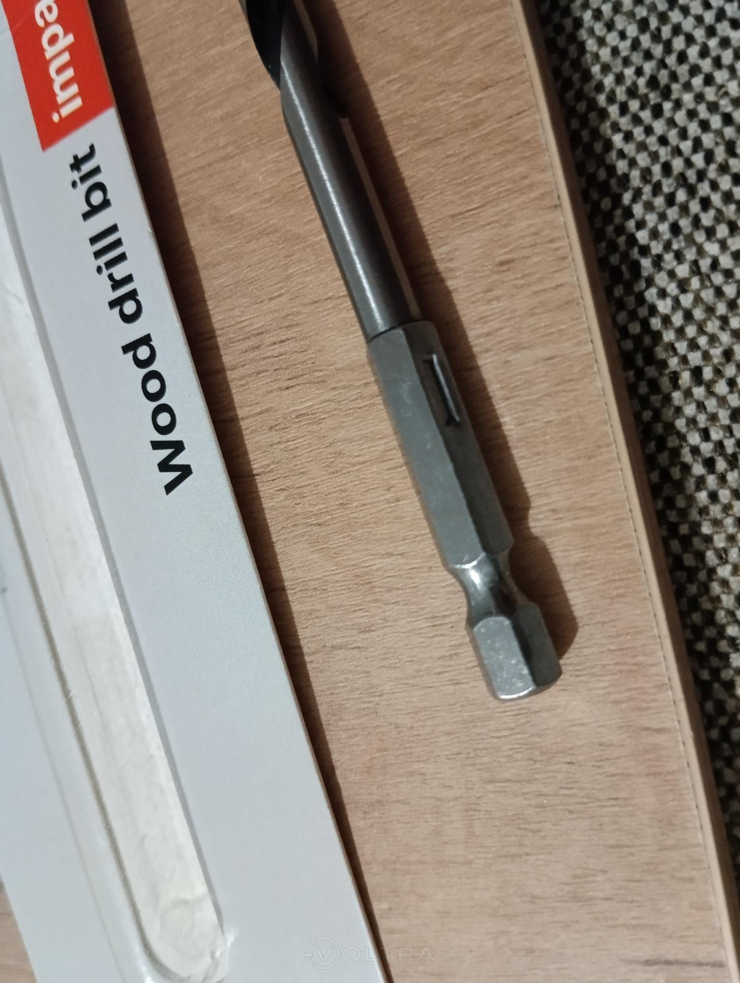 Сверло по дереву из крепкого металла, ровное, при вращении вибрации нету. Само по себе острое, сверлит дерево довольно резво. Хвостовик сверла имеет грани, что очень удобно для фиксации в кулачковом механизме дрели, сверло при затруднениях благодаря этому не прокручивается в зажиме и не застревает. Хорошее соотношение цены и качества.