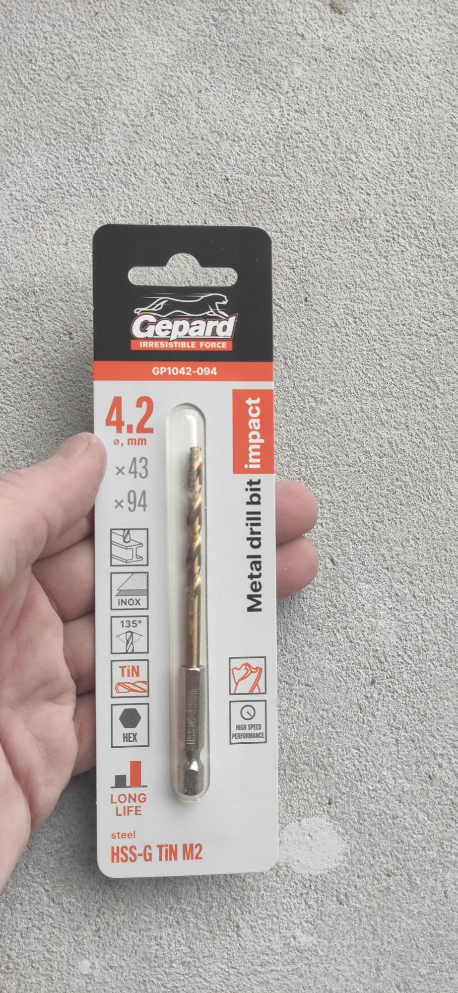 Достоинства: Очень хорошего качества сверло по металлу с шестигранным хвостовиком. Диаметр 4.2 миллиметров, режущая поверхность 43 миллиметра и общая длина 94 миллиметра . Фирма производитель Gepard. Использую для сверления отверстий в ДСП под ручки, сверлит отлично, заусенцев не оставляет. Цена качество соответствует полностью.