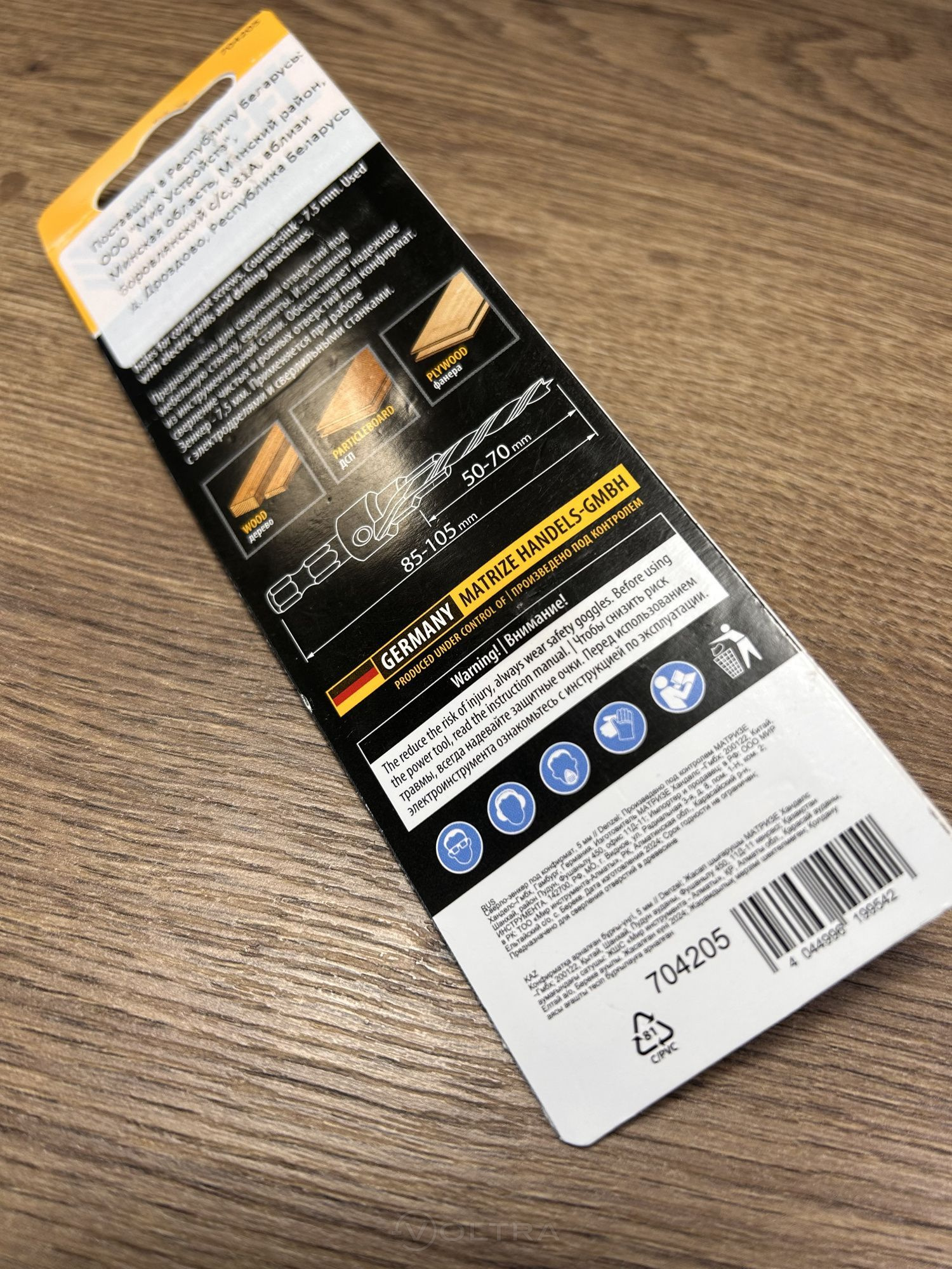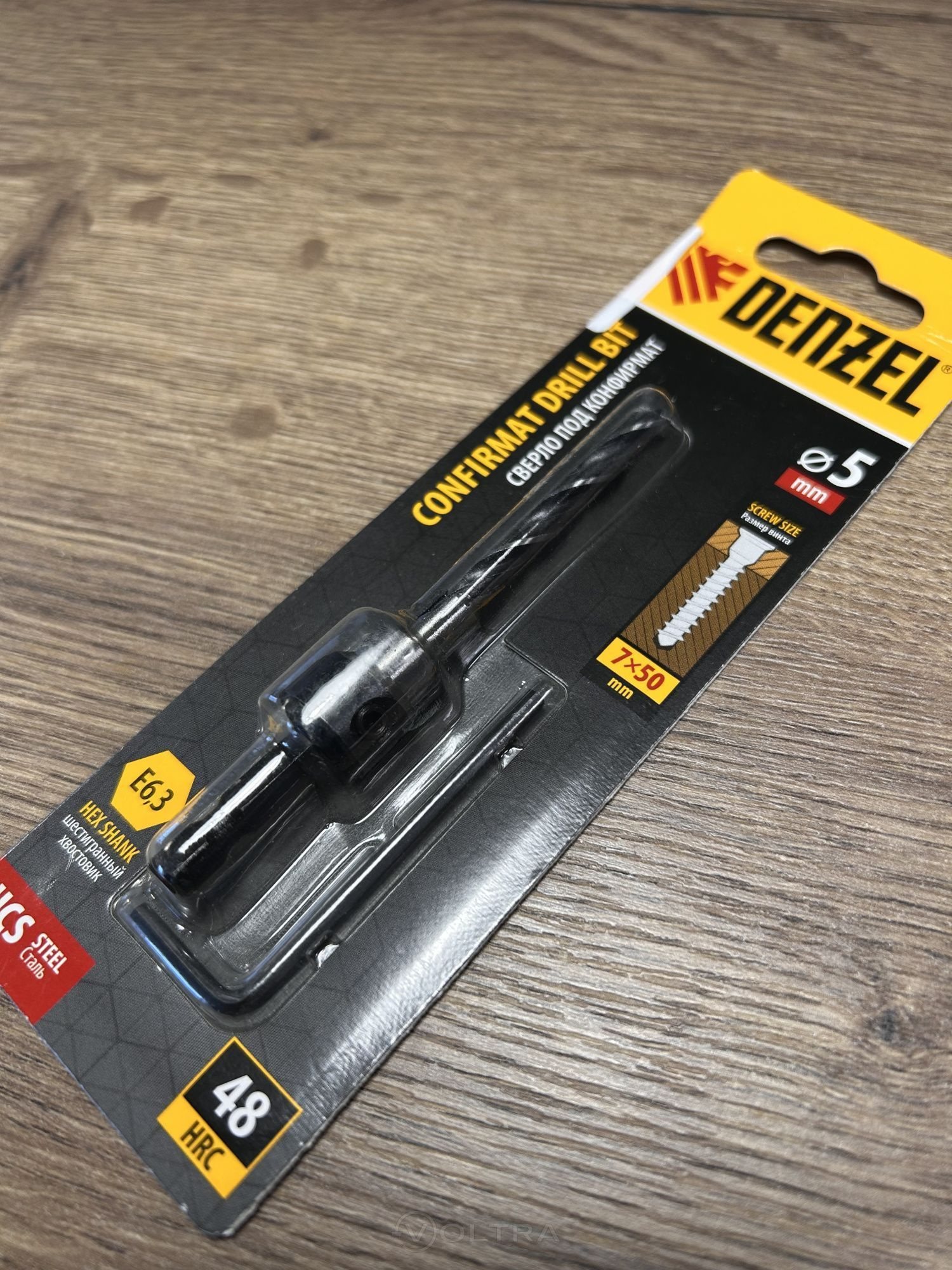 Достоинства: Очень хорошего качества сверло-зенкер под конфирмат . Диаметр свела 5 миллиметров. Сверлит отверстия под конфирматы 7*50. Фирма производитель Denzel . Поставляется в индивидуальной упаковке. Само сверло очень острое. Углубление под шляпку конфирмат сверло отлично. Цена качество соответствует полностью.