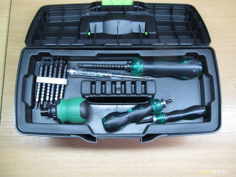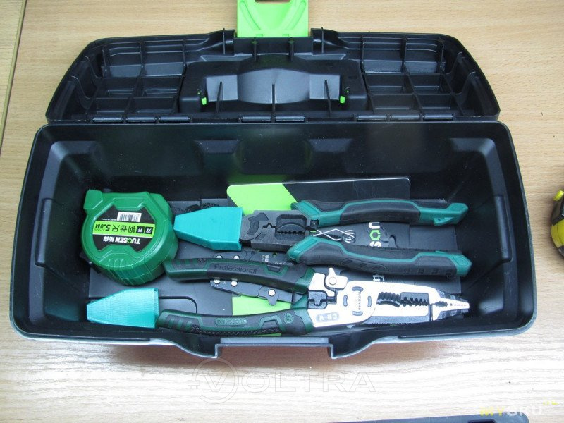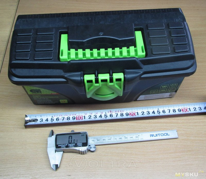 Первое впечатление когда видишь его в реале — «ути бозеньки!». Он маленький. Вот прям меньше чем ожидаешь даже зная его размеры и прикинув оные размеры рулеткой. Фото не передают и половины впечатления. При этом не забываем о форме — заявленным размерам он соответствует, но это его максимальные размеры, то есть вот этот буртик на стыке с крышкой. а вот по донышку уже имеем 285х110мм. Тем не менее, именно всякий мелкий инструмент, типа отверток, плоскогубцев и т.п — великолепно в него помещается Петли и замки выглядят вполне надёжно. Стенки по толщине не измерял, но тонковат, как говорится, «звезд с неба не хватает» в плане жесткости. Вес пустого чемодана без вставки — всего 350г. Но и не забываем во-первых о цене, а во вторых о размерах — сюда один черт ничего большого и тяжелого не сложишь. Да и заявлено 10 кило нагрузка (ну и наступить ребенку можно — до 50кг допустимо). Да я, собственно, и не ждал от него ничего такого, и изначально позиционировал его как компактный пристойно выглядящий недорогой ящик для хранения в квартире мелкого инструмента. Эту задачу он выполняет на 100%. А вот если вам таскать его на стройку, ронять с третьего этажа, топтаться ботинками — придётся поискать что-то другое, подороже-получше