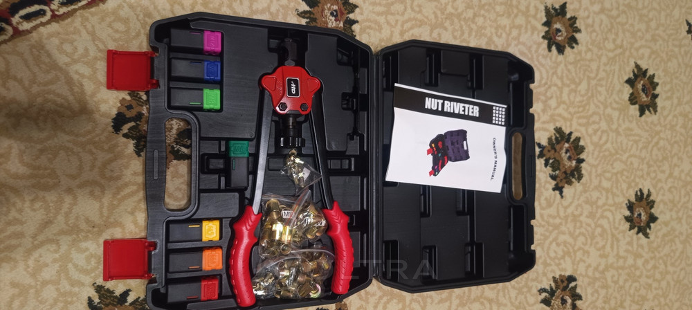Сначала попробовал на пластине, затем решил повесить калитку на завесы. Первую рабочую сжал от всей души, что-то щелкнуло, оказалось, что сорвало резьбу в заклепке. После пошло, как по маслу. Заклепки ставил стальные 5мм. Жать сильно не нужно, заклепочник работает от сжатия ниже среднего мужского усилия, даже женского усилия хватит. В коробку поместились мои клепки и сверла. Когда потеплеет, буду собирать навес в огороде, на болтах с профиля 20х20, проверю другие диаметры. Насадки меняются очень просто, одну выкручиваешь, другую вкручиваешь, зажимаешь гайкой. Все от руки. Покупкой доволен, рекомендую